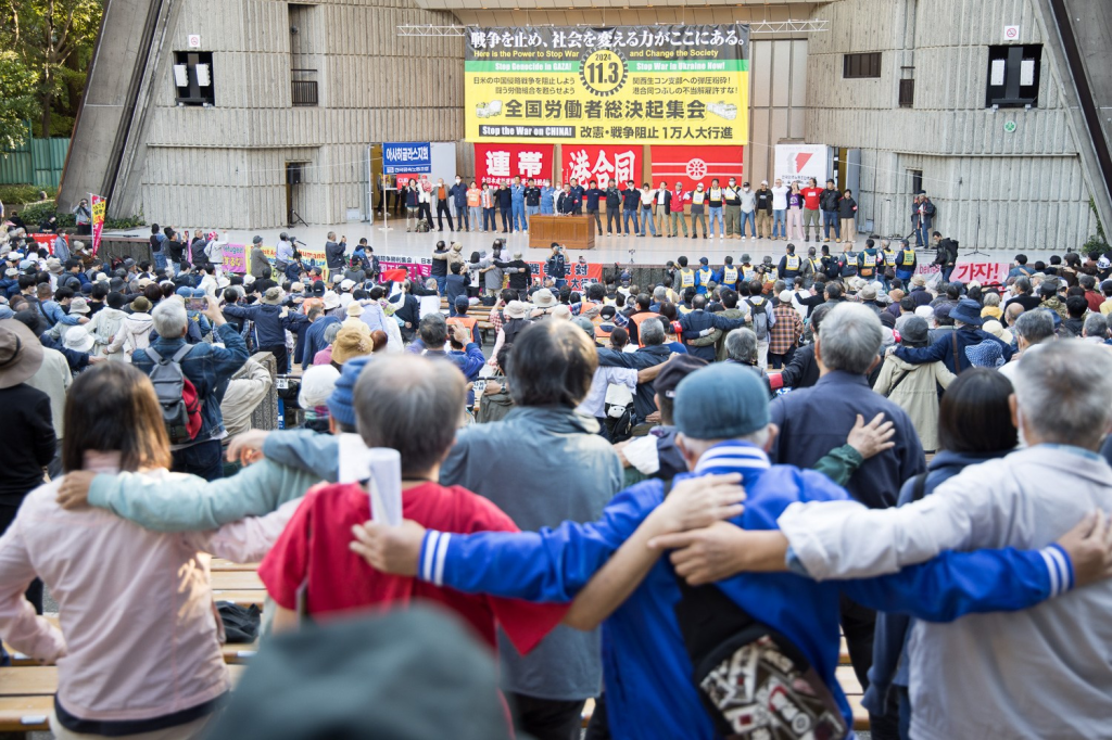 Työväen antimilitaristinen mielenosoitus Tokiossa kokoontui sunnuntaina Hibiya-ulkoilmakonserttisalille tunnuksenaan ”Tässä on voima pysäyttää sota ja muuttaa yhteiskunta”. Puheenvuorojen ja esitysten jälkeen kymmenen tuhannen marssi suuntasi kaupungille.