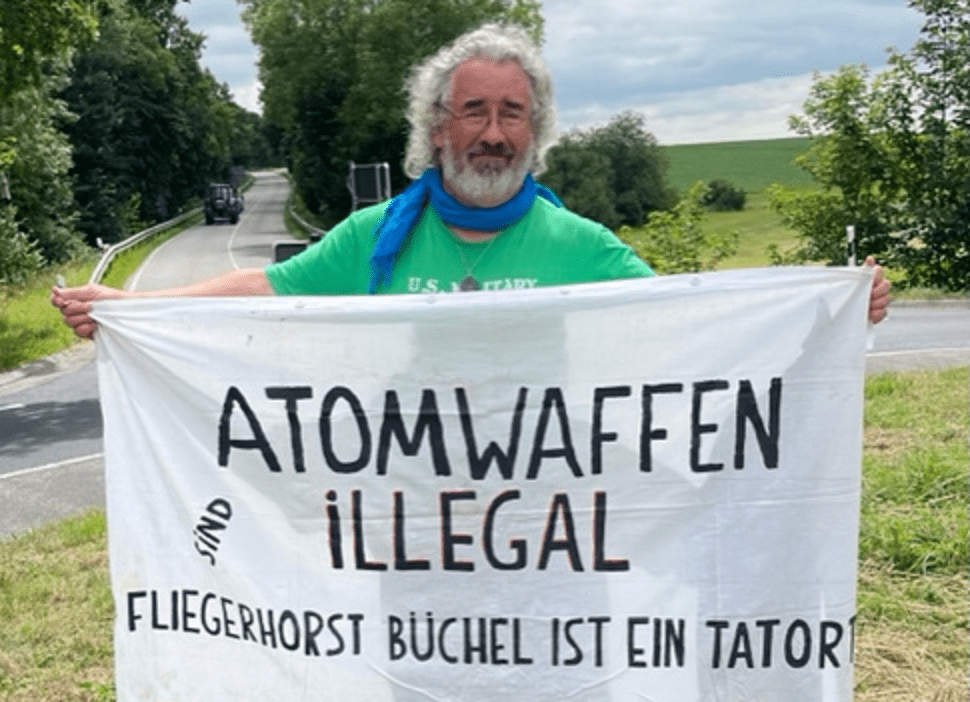 – Loppujen lopuksi saksalaiset tuomioistuimet eivät kuitenkaan ole valmiimpia kuin Yhdysvaltojen tuomioistuimet kuulemaan järkevää väitettä siitä, että amerikkalaiset ydinpommit, joita pidetään Büchelissä NATOn ”ydinjakosopimuksen” nojalla ja jotka ovat valmiita lastattavaksi saksalaisiin lentokoneisiin ”toimitettaviksi”, kun niin määrätään, rikkovat lukuisia lakeja, mukaan lukien vuoden 1970 sopimus, jossa mainitaan ydinaseiden leviäminen eksistentiaalisena uhkana kaikelle elämälle tällä planeetalla.