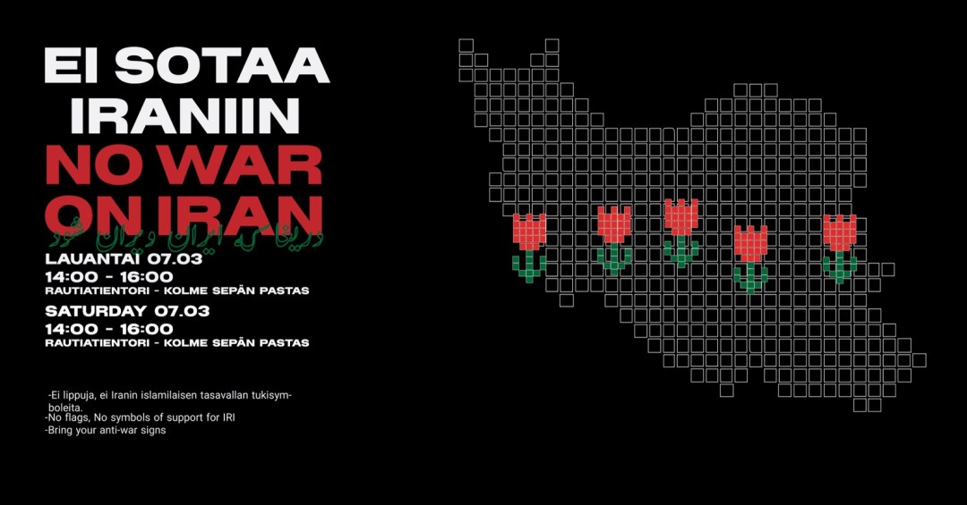 Tule ystäviesi ja yhteisösi kanssa rauhanmarssille, jolla vastustamme Yhdysvaltojen ja Israelin aloittamaa sotaa Irania vastaan. Kouluja, sairaaloita ja asuinalueita pommitetaan nyt kaikkialla maassa. Israelin ja USA:n iskut tappoivat ja haavoittivat vain muutamassa päivässä useita satoja siviilejä, mukaan lukien lapsia. Tämän on loputtava NYT! Hyökkäys on kansainvälisen oikeuden vastainen ja se tuhoaa iranilaisten elämää ja tulevaisuutta. Kokoonnumme osoittamaan, ettemme suvaitse uutta imperialistista sotaa Länsi-Aasiassa. Kädet irti Iranista! Ei sotaa Irania vastaan!