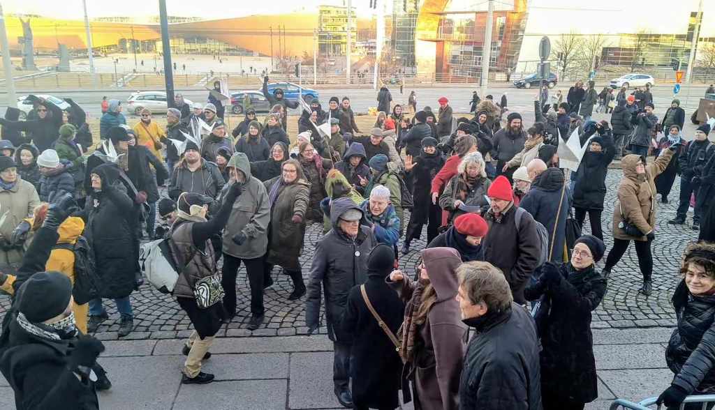 Eduskuntatalolla osoitettiin mieltä perjantaina ydinaseiden Suomeen sijoittamista vastaan. Musiikin ja esitysten lomassa rauhanaktivistit ja poliitikot käyttivät puheenvuoroja.
