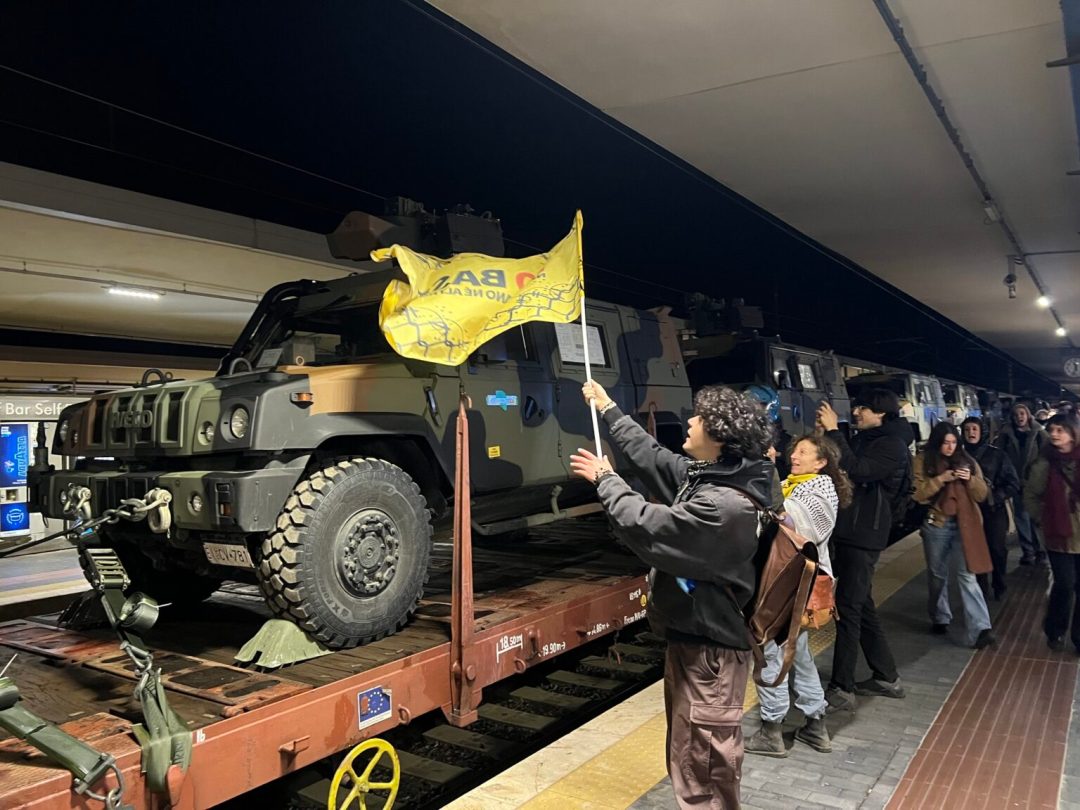 Ammattiliittojen ja paikallisten aktivistiliikkeiden yhteistyön ansiosta panssaroituja ajoneuvoja ja aseita kuljettanut juna pysäytettiin Italiassa Pisan asemalla torstaina 12. maaliskuuta.