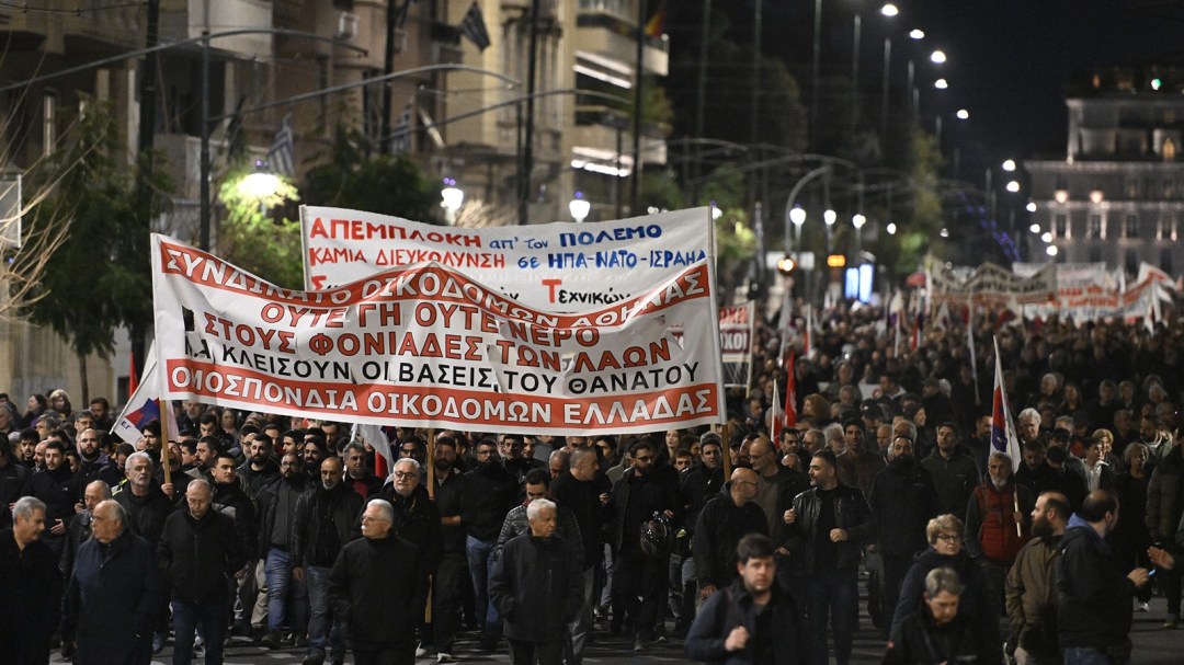Kreikan radikaali ay-rintama PAME järjesti perjantaina mielenosoitusmarssin keskeisenä iskulauseenaan ”Kreikka ulos sodasta” ja ”Suljetaan Yhdysvaltojen ja NATOn sotilastukikohdat”.