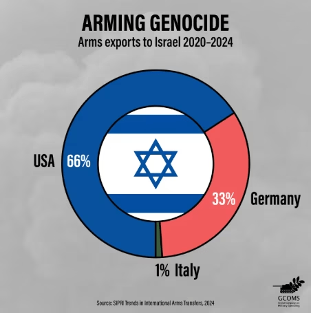 Kiistanalainen aseiden myynti Israelille tekee viejämaista osallisia Palestiinan kansanmurhakampanjaan. Maailmanlaajuinen aseiden myynti Israelille on kasvanut merkittävästi 7. lokakuuta 2023 lähtien. Lokakuun 2023 ja syyskuun 2025 välisenä aikana sotilasapu ja aseiden siirrot Israeliin olivat pelkästään Yhdysvalloista noin 21,7 miljardia dollaria.