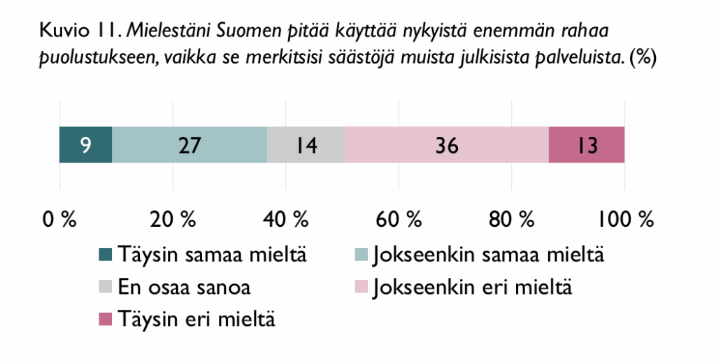 Vain 9% oli täysin samaa mieltä väitteen kanssa, että Suomen valtion pitäisi käyttää nykyistä enemmän rahaa puolustukseen, vaikka se merkitsisi säästöjä muista julkisista palveluista, 27 % ollessa jokseenkin samaa mieltä. Enemmistö suomalaisnuorista tuomitsee (49 % jokseenkin tai täysin eri mieltä) sotilasmäärärahojen kasvattamisen julkisten palvelujen kustannuksella. Sotilasmenojen kasvattamista vastustavat erityisesti köyhät.