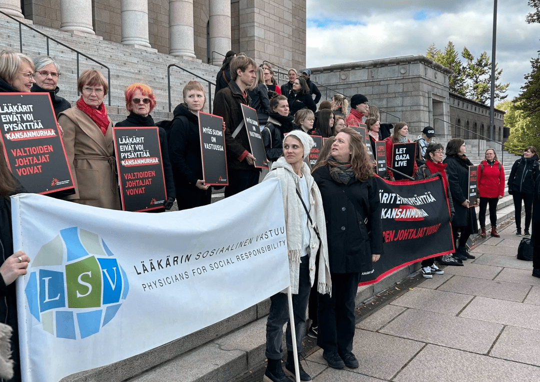 Lääkärit kokoontuivat eduskuntatalolle vaatimaan Suomelta välittömiä toimia kansanmurhan pysäyttämiseksi ja sairaanhoidon suojelemiseksi Gazassa. Suomen on käytettävä kaikkia poliittisia, taloudellisia ja diplomaattisia keinoja painostaakseen Israelia.