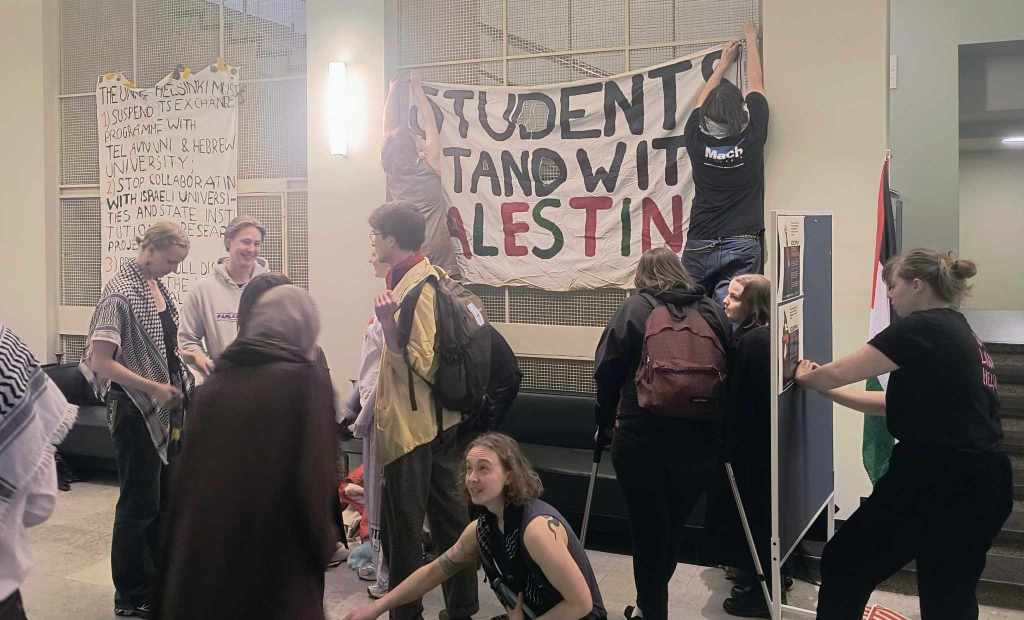Opiskelijat kokoontuivat kello kymmeneltä aamulla mielenosoitukseen Helsingin yliopistolla vastustamaan yliopiston yhteistyötä israelilaisten yliopistojen kanssa.