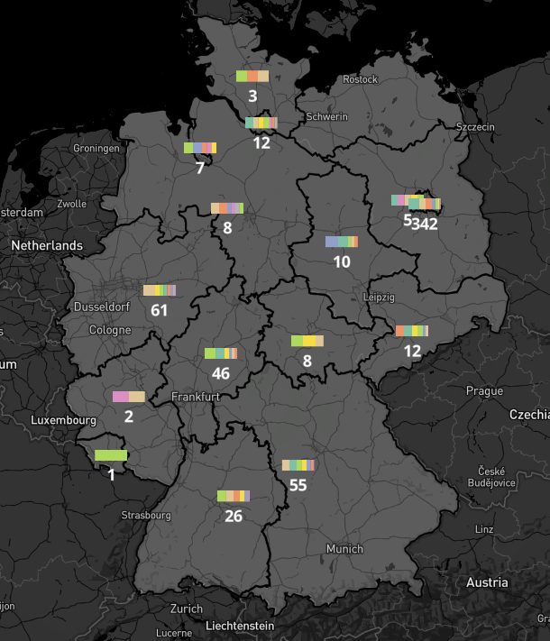 Kartta näyttää sortotoimenpiteet eri Saksan paikkakunnilla.