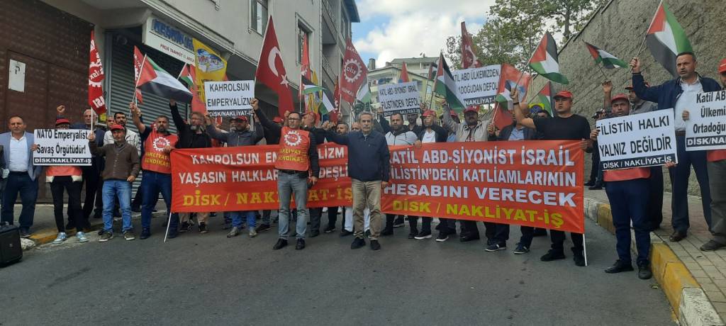 Kuljetusalan liitto Nakliyat-İş on tänään keskiviikkona järjestänyt mielenosoituksen Palestiinan puolesta Turkissa. Logistiikkakeskusten työläiset marssivat liiton johdolla ulos työpaikoiltaan Beyazıt-aukiolle Istanbulissa.