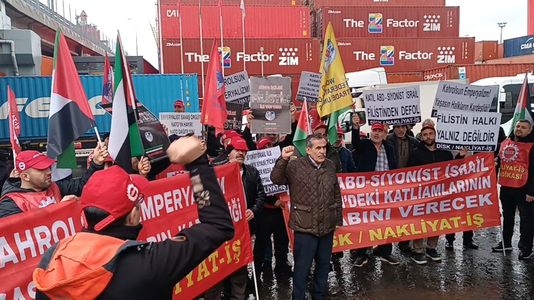 Keskiviikkona kuljetusalan ammattiliitto Nakliyat-İş järjesti solidaarisuusaktion palestiinalaisten tueksi Ambarlın satamassa Istanbulissa, jossa materiaalin kuljetus Israeliin jatkuu.
