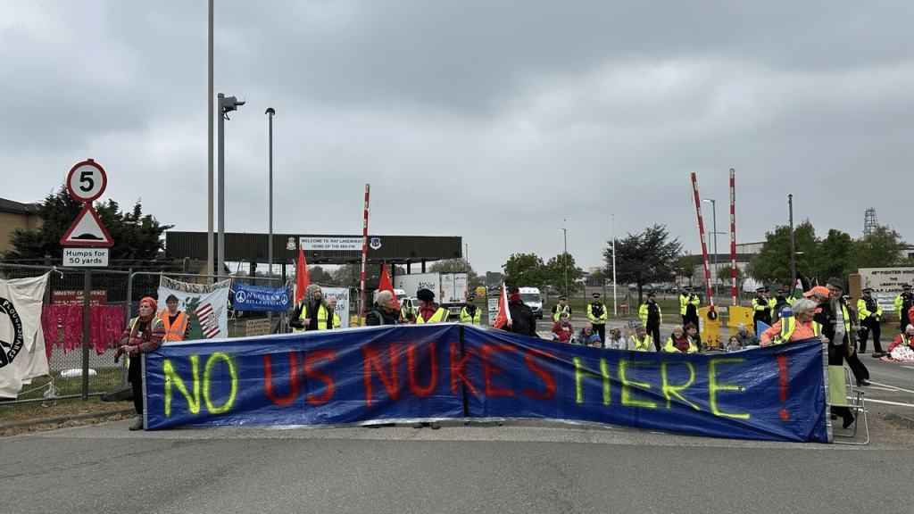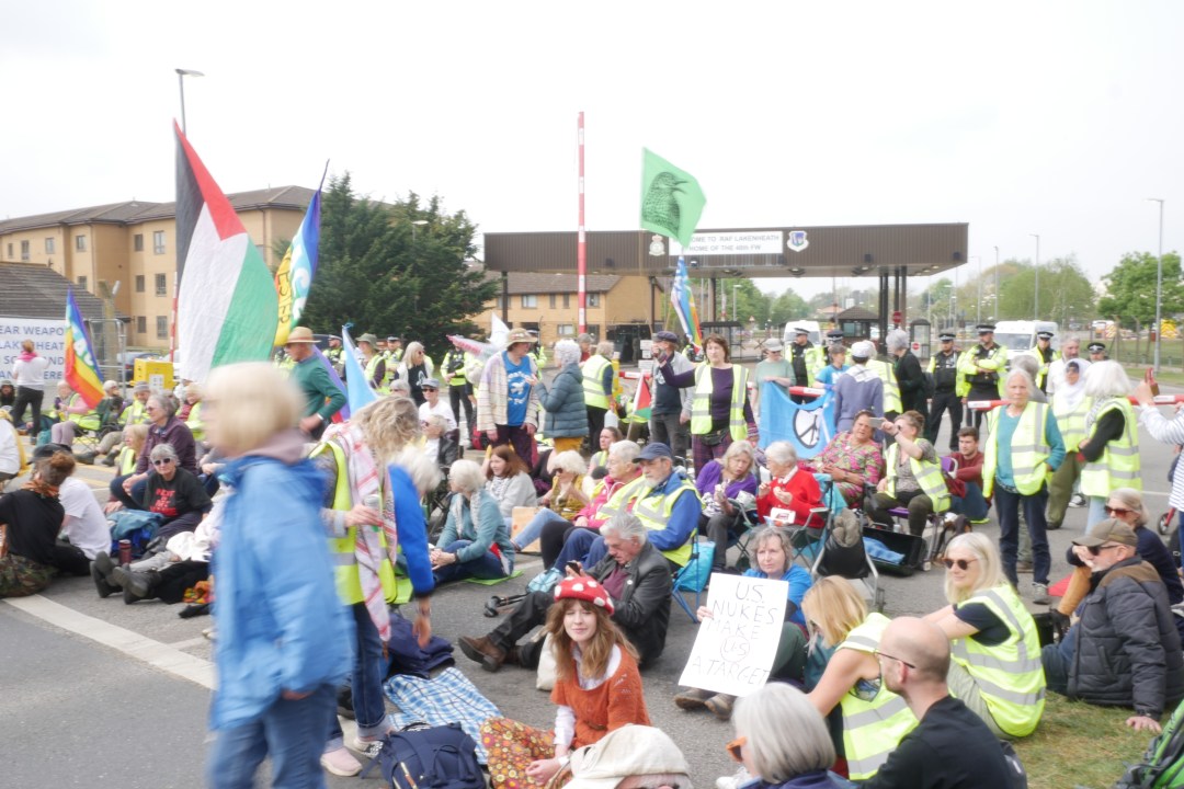 Aiemmin rauhanleirin kahdentenatoista päivänä kaksitoista naista, intersukupuolista, ei-binääristä ja transaktivistia – iältään 24–91 – estivät kulun RAF Lakenheathin pääportilla ja tuomitsivat sotilaallisten päästöjen, ilmaston tuhoutumisen, autoritaarisuuden ja kansanmurhan väliset yhteydet. Kolme pidätettiin poliisin toimesta.